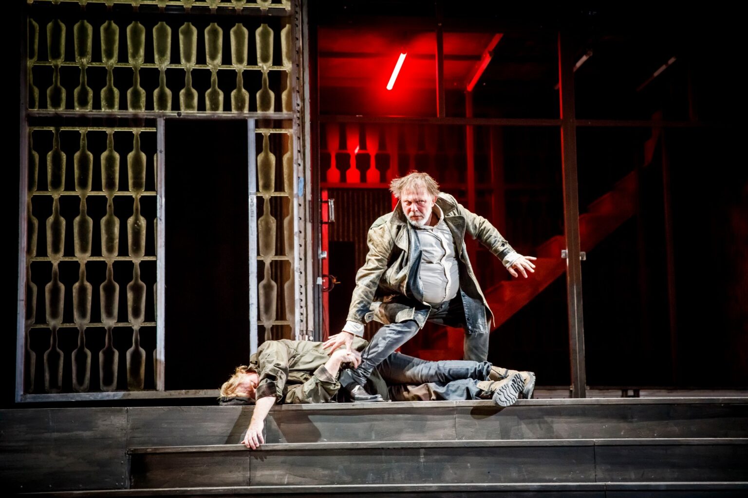 Zdjęcie przedstawiające aktora ubranego w srebrną zbroję, trzymającego nogę na klatce leżącego aktora ubranego w historyczny kostium