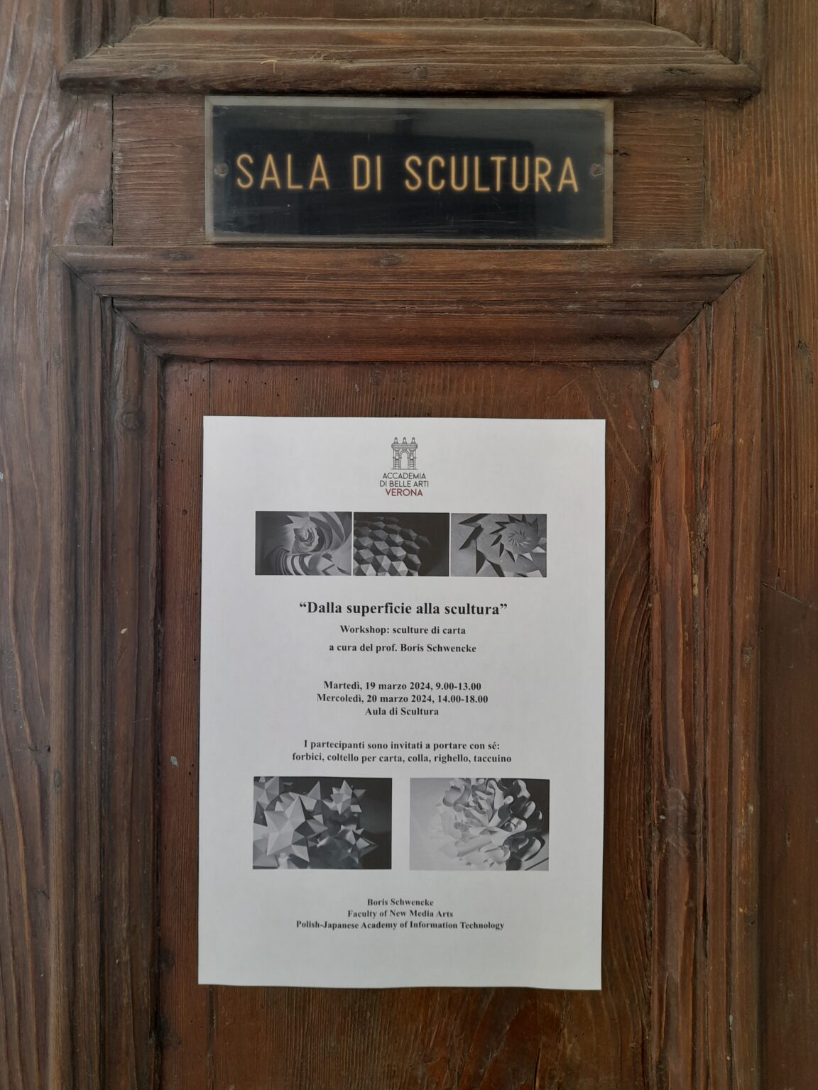 W marcu 2024 r. dr hab. Boris Schwencke poprowadził warsztaty zatytułowane „Od powierzchni do rzeźby” na Akademii Sztuk Pięknych w Weronie.