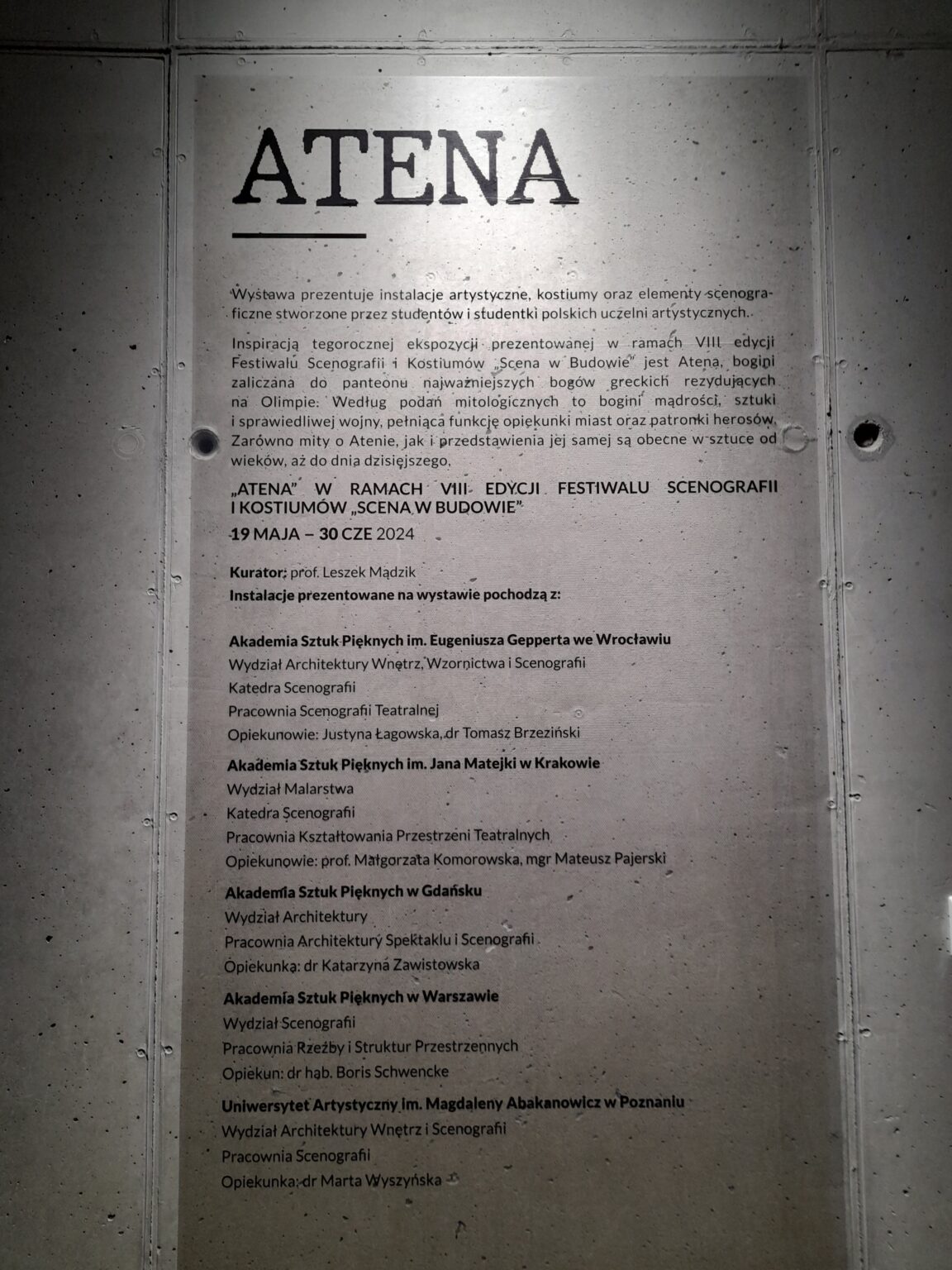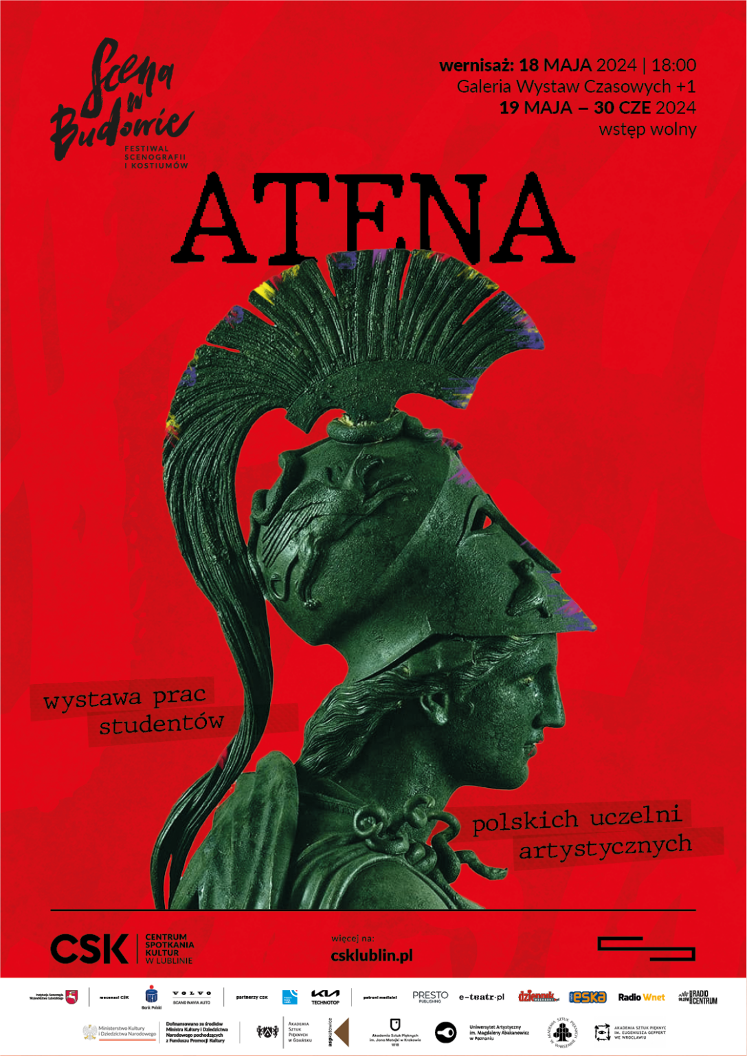W dniu 18 maja 2024 w Centrum Spotkań Kultur (CSK) w Lublinie odbył się wernisaż wystawy „Atena”. Na wystawie zorganizowanej w ramach festiwalu scenografii i kostiumów „Scena w Budowie” zaprezentowano prace studentów z pięciu uczelni w Polsce (Gdańsk, Kraków, Poznań, Wrocław i Warszawa). Wydział Scenografii ASP w Warszawie reprezentowały Katarzyny Różok („Filozofia wojny”), Julia Smogorzewska („Atena – rozdarcie”) i Zuzanna Surdy („Narodziny Ateny”). Opiekunem był dr hab. Boris Schwencke.